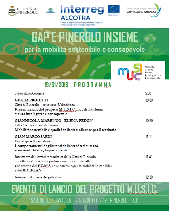 Parte Venerdì 19 Gennaio nel Comune di Pinerolo (TO) il progetto denominato M.U.S.I.C. (Mobilità Urbana Sicura Intelligente e Consapevole). Simurg Ricerche si occuperà del Piano Urbano della Mobilità Sostenibile (PUMS) nel suo percorso partecipativo. Le altre azioni previste dal progetto sono una campagna di comunicazione sulla mobilità sostenibile, dotazione di mezzi di trasporto innovativi e a basse emissioni, potenziamento dell’offerta ciclabile e di trasporto pubblico, servizio pedibus, riorganizzazione della circolazione stradale attorno agli edifici scolastici, ecc.